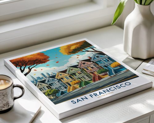Vibrant illustration travel poster of San Francisco’s famous Painted Ladies. Perfect for adding a pop of color to any room.