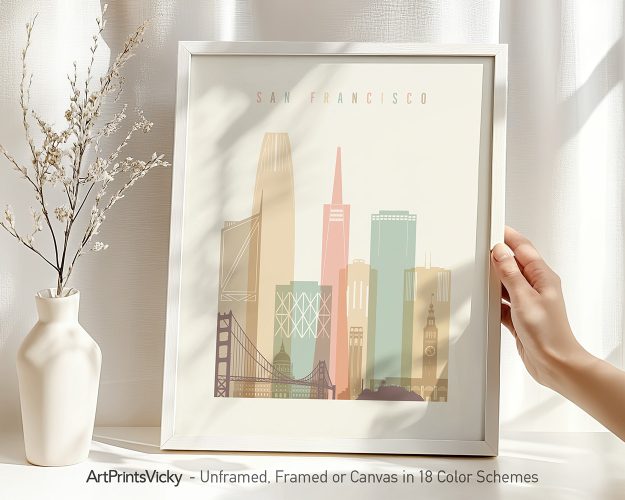 Seeking to add a touch of San Francisco’s charm to your space? This pastel cream wall art print captures the essence of the city, bringing an elegance to any room. Perfect as a unique gift for a friend or a stylish addition to your home or office decor, this poster adds a serene and sophisticated atmosphere wherever it’s placed.