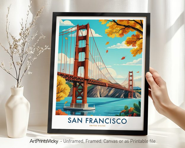 Stunning wall art print of the iconic Golden Gate Bridge, perfect for travel enthusiasts and city lovers. A colorful illustrated poster for any space.