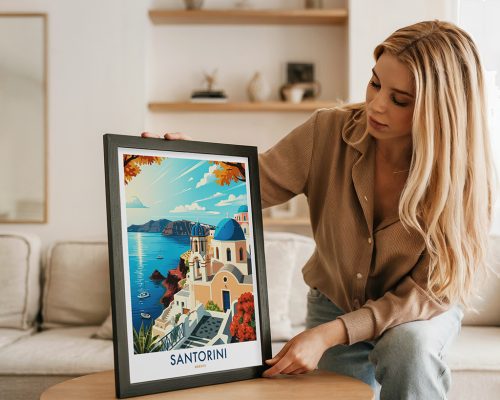 Transform your any room with this Santorini Greece art print. This wall art captures the iconic blue-domed churches perched on the cliffside, overlooking the crystal-clear Aegean Sea and dramatic caldera. Whether displayed in your living room, bedroom, or office, this high-quality poster brings Mediterranean magic into any interior. Perfect as a meaningful gift for travel enthusiasts, honeymooners, or anyone who dreams of the Greek Islands, this art print serves as both beautiful decor and a daily visual escape to one of the world’s most enchanting destinations.