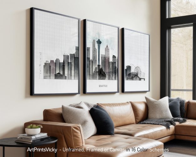 Add a touch of urban sophistication to your space with our Seattle skyline triptych in urban 1 style. Each print captures the essence of the city, bringing energy and sophistication to your living room, bedroom, or office. Perfect for creating a modern and stylish atmosphere, these prints will become the focal point of your wall art collection.