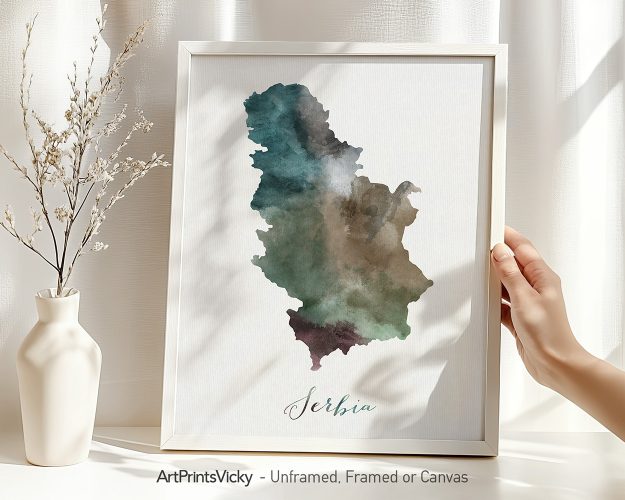 Celebrate the rich history and diverse landscapes of Serbia with this captivating watercolor map art print. Earthy tones dance across the map, capturing the essence of this vibrant Balkan nation. The name “Serbia” is rendered below the map in a flowing script, adding a personalized touch. The textured background adds a touch of rustic charm, making this a stunning piece for anyone who cherishes this central European gem.