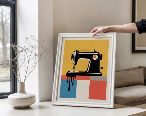 Nostalgic pop art print of classic sewing machine in bauhaus style. Perfect for craft rooms, sewing studios, or gifts for seamstresses and quilters.
