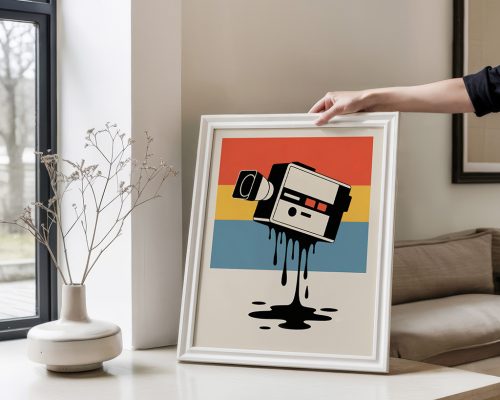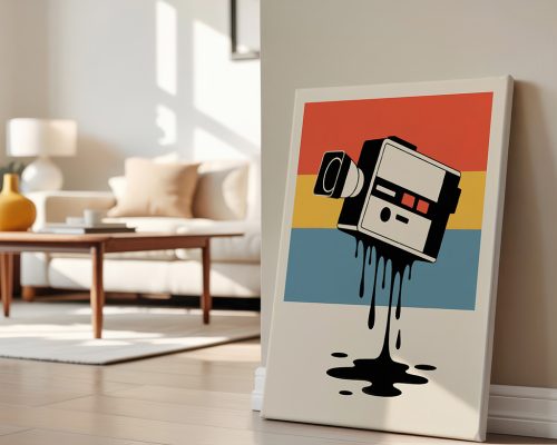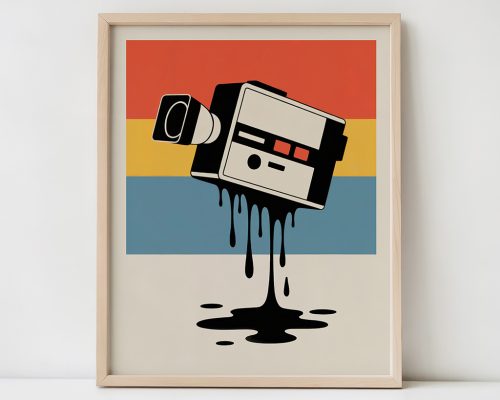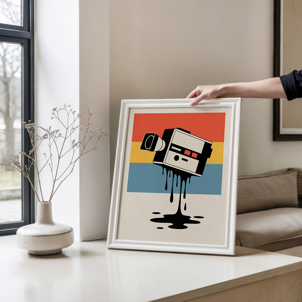 Retro camcorder pop art print, perfect gift for film buffs, vintage decor fans, or retro enthusiasts.