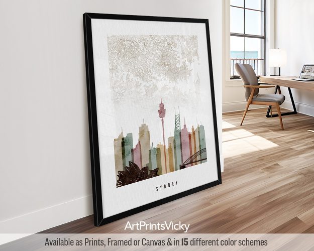 An artistic city map print of Sydney alongside its striking skyline, all in watercolor 1 style. This poster elegantly showcases the city’s streets and famous landmarks, making it an ideal piece to bring a touch of the city’s charm to your living space, bedroom, or office. A delightful gift for anniversaries or housewarmings.