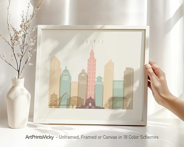Taipei poster, featuring soothing pastel cream hues. Perfect for injecting a breath of fresh air into any room, this art print enhances home decor, serves as a thoughtful gift, and inspires creativity in the office.