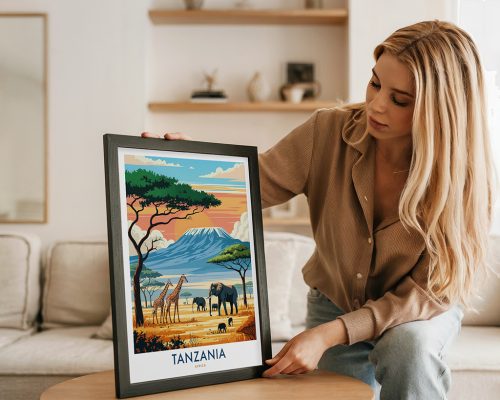 Embark on a visual journey to Tanzania with this safari landscape art print. It’s perfect for nature lovers, travel enthusiasts, or anyone seeking exotic, inspiring wall decor.