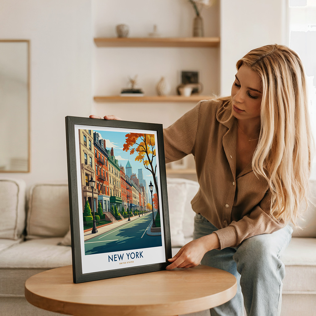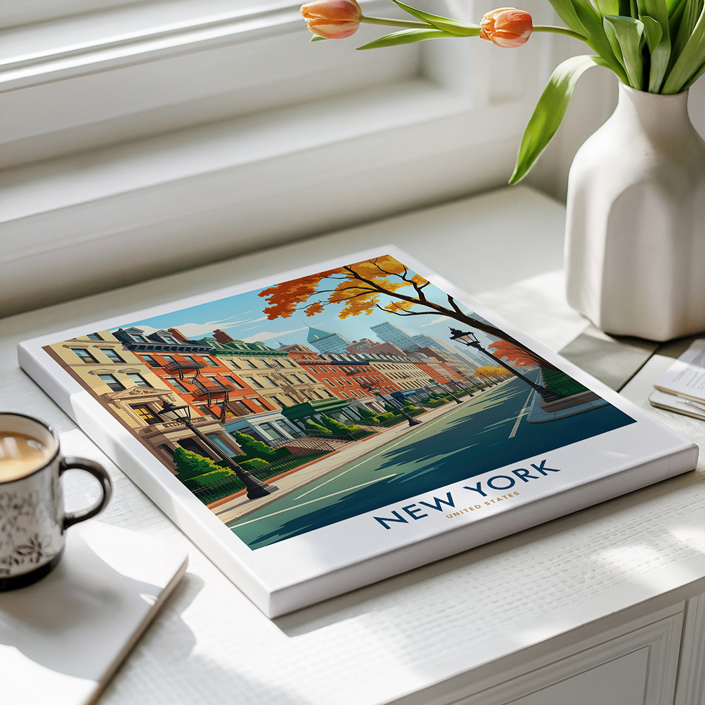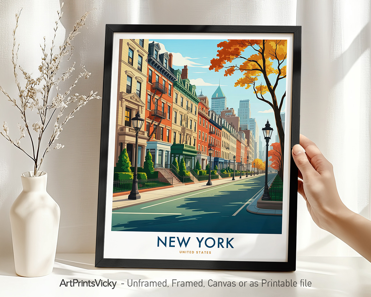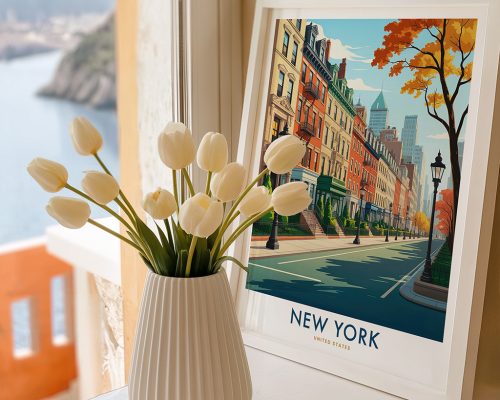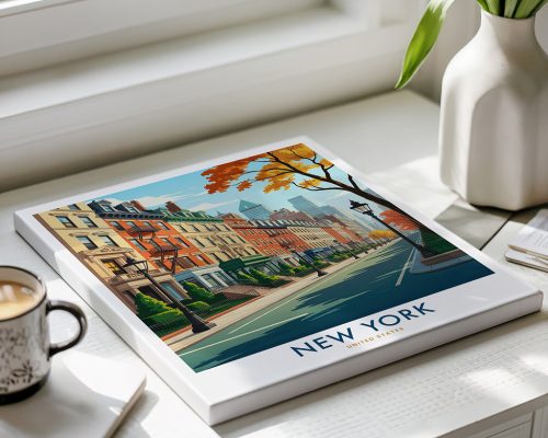 Stroll through the sophisticated streets of New York’s Upper East Side with this art print. Featuring classic brownstones and tree-lined avenues, it’s perfect for NYC enthusiasts, urban architecture lovers, and those seeking elegant city wall decor.