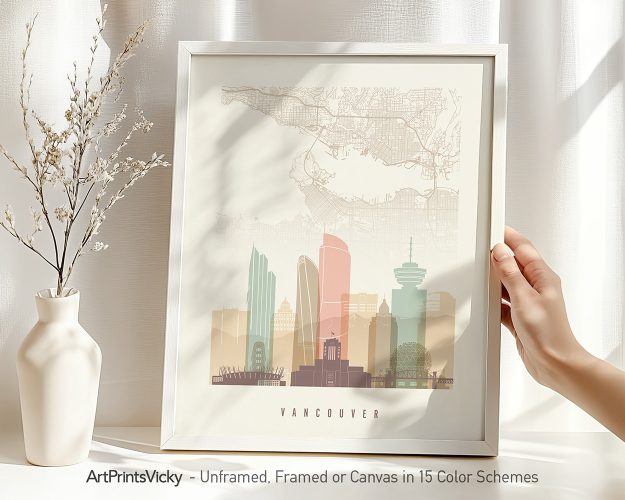 A one-of-a-kind city map print of Vancouver combined with its striking skyline, in pastel cream hues. This poster captures the essence of Vancouver’s streets and famous landmarks in a stylish way. Perfect for adding a touch of the city’s charm to your living space, bedroom, or office.