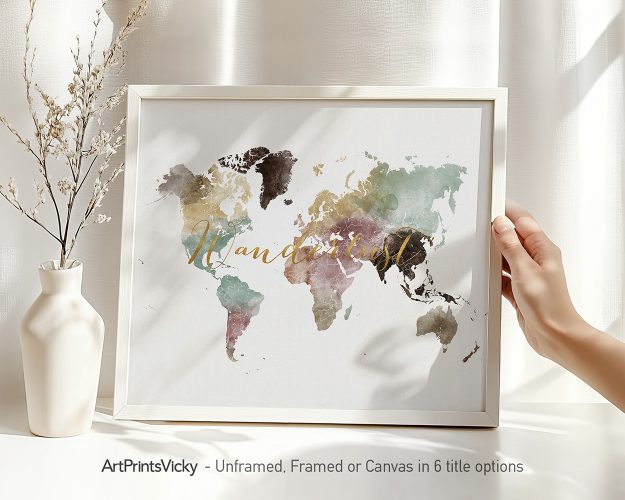 If you ever experience wanderlust, an intense urge to travel the world, then you will love the Wanderlust World Map Watercolor 1 Poster. It features a gorgeous watercolor-effect world map design that uses a combination of vivid, vibrant colors. This travel art print has the word ‘Wanderlust’ printed in a simple yet effective typeface and has a simple white background which contrasts beautifully against the loud colors used for the design.