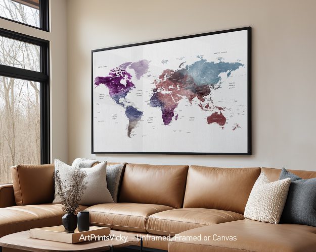 Bring the beauty of the world to your walls with this labeled world map poster. Featuring vibrant purple and blue tones, this detailed artwork highlights country borders, major cities, and geographical features. Perfect for home, office, or classroom decor, this poster is available as unframed, framed, or canvas options to suit your style. Its elegant design makes it a versatile piece for travelers, geography enthusiasts, or anyone looking to add a sophisticated touch to their space.