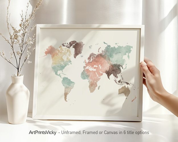 The soft hues used on this World Map Poster Pastel are sure to brighten up any white, beige or magnolia wall – or any other color wall for that matter! This travel art print features a gorgeous combination of pastel tones, which bring to life a world map silhouette design. With it’s watercolor-effect graphics and off-white background, this print has a timeless style, making it perfect for modern settings, as well as more classic decors.