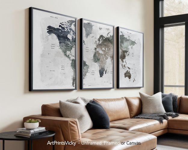 Bring a sense of wanderlust and sophistication to your walls with this stunning watercolor world map triptych, rendered in deep, earthy tones. Each panel showcases a section of the world, complete with country and major city names, making it both a stylish and educational piece. Perfect for modern and rustic decor styles alike, this map set is available unframed, framed, or on canvas, adding elegance to any room. Ideal for travelers, decor enthusiasts, and anyone with an appreciation for beautifully crafted wall art.